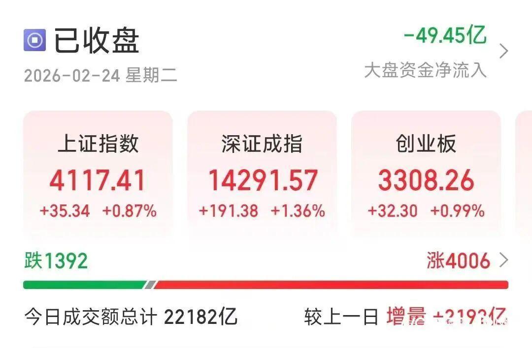 截至2月24日收盘,沪指报4117.41点,涨0.87%,深成指报14291.57,涨1.36%,创业板指报3308.26,涨0.99%,沪深京三市成交额22182亿元,较上一交易日放量2192亿元,超4000只个股上涨。